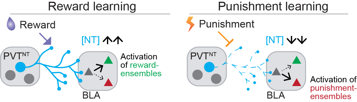 Taken together, these findings indicate a neuropeptide that signals valence in the BLA, and show that NT is a critical modulator for assigning positive and negative valence in amygdala neurons during associative learning.